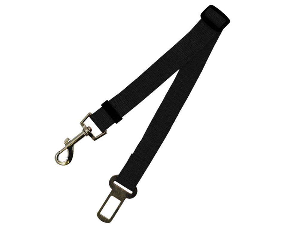 Bezpečností pás černé barvy pro psy s regulovatelnou délkou. Nezbytná pomůcka pro transport psa v autě. Pomocí tohoto pásu připoutáte postroj psa ke standardnímu uchycení pásu v automobilu.