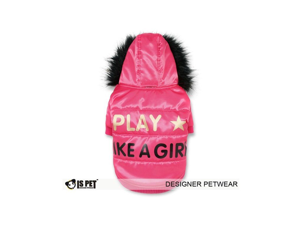 Tmavě růžová zimní bunda z kvalitní jemné šusťákoviny a s nápisy na zádech"Play - Like a Girl". Kapucka je lemovaná černou kožešinou. Rukávy a zada zakončeny náplety ve stejné barvě bundy. Zapínání na patentky v dolní části bundy. Zevnitř je bunda podšitá jemnou kožešinkou ve stejné barvě. Teplá a elegantní bundička.Délka budy je 22 cm.