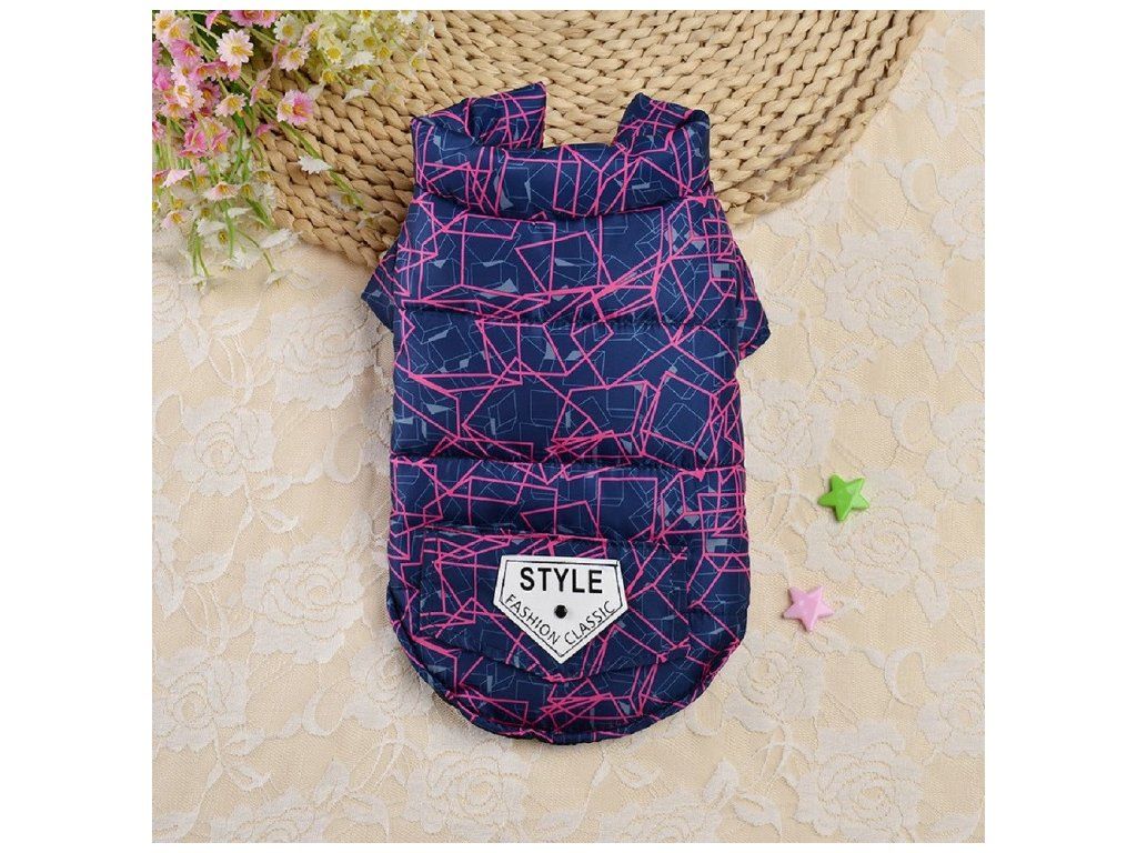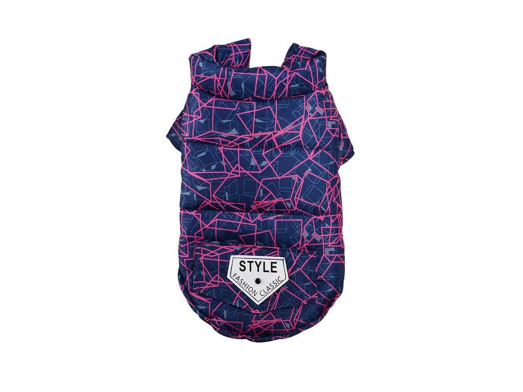 Praktická, lehce zateplená nylonová bunda se zapínáním na druky na bříšku pejska. Vestička ma na zádech očka na připnutí vodítka.