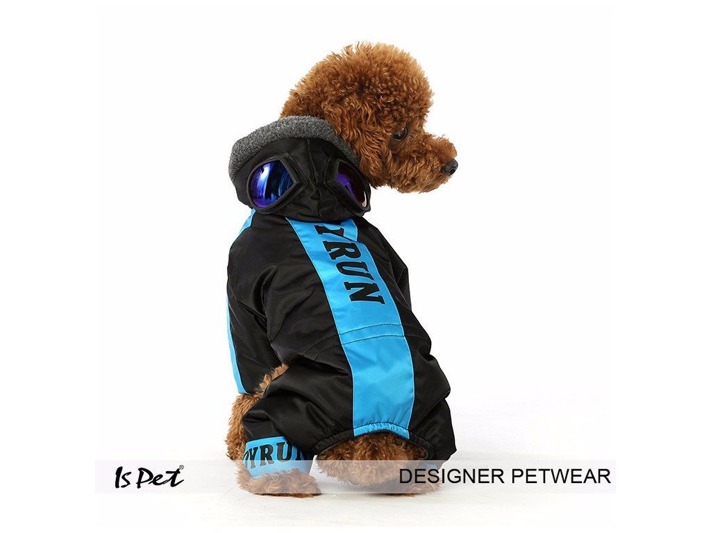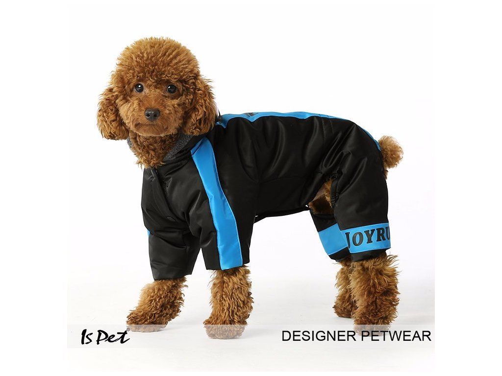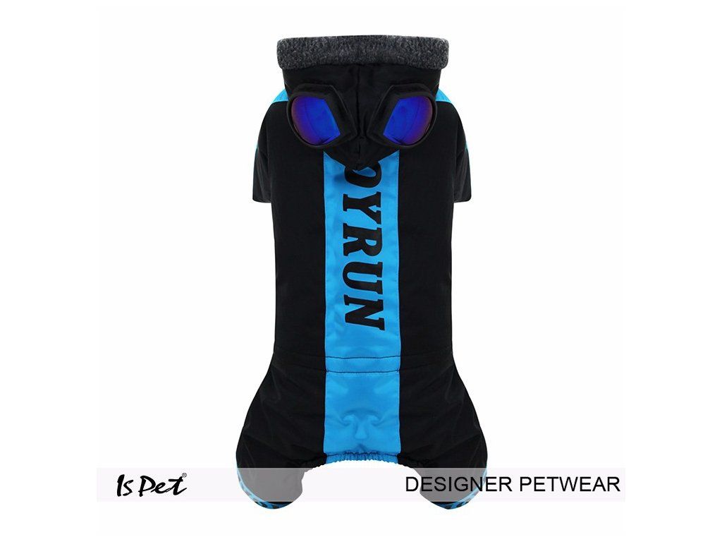 Praktická, elegantní kombinéza v černé barvě s modrým pruhem. Kombinéza je velmi dobře zateplena tedy pejskovi rozhodně nebude zima. Kombinéza má praktický otvor na vodítko.