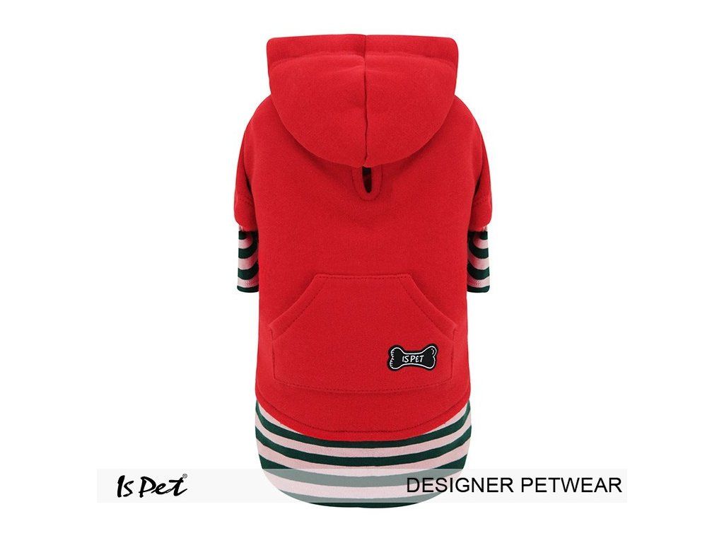 Krásná a na dotek příjemná a teplá mikina pro psa z počesané teplákoviny. Mikina je dostupná ve dvou barevných kombinacích červené a modrošedé vždy v kombinaci s pruhovaným úpletem. Mikina má kapucku a praktický otvor pro vodítko. Mikina je převážně bavlněná a částečně pružná. Na bříšku je guma aby pod mikinu nefoukalo a zároveň aby pěkně seděla a na zádech je kapsička.