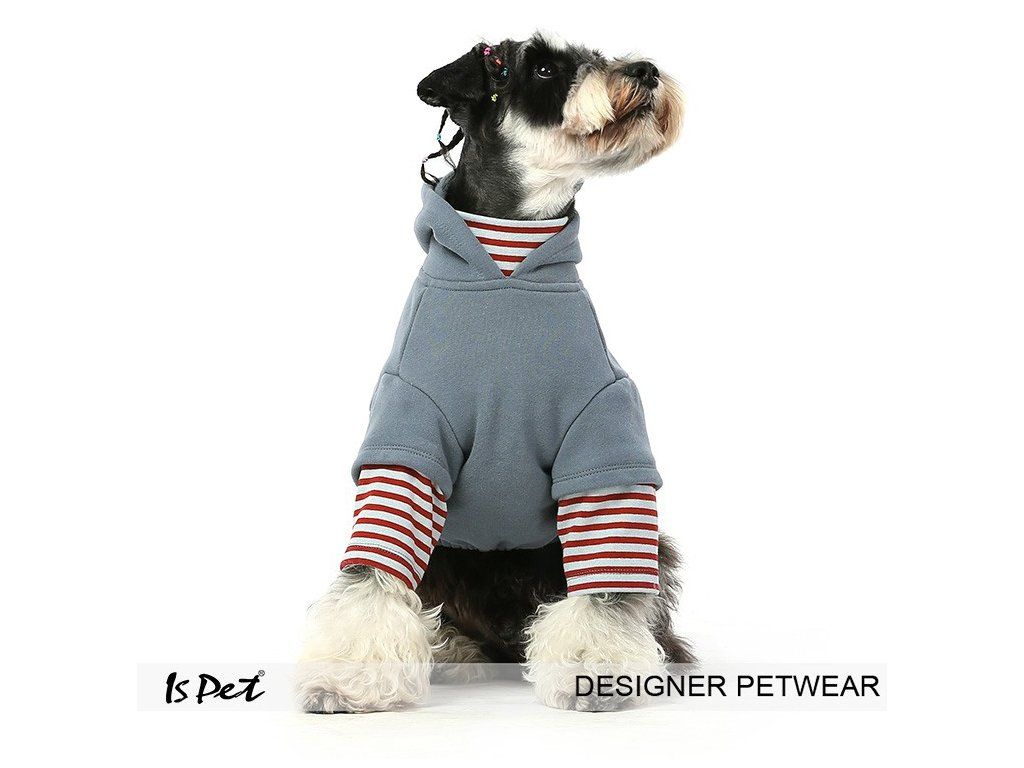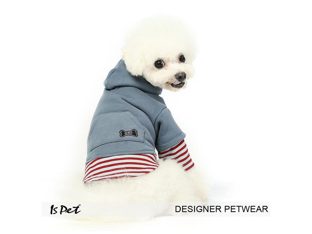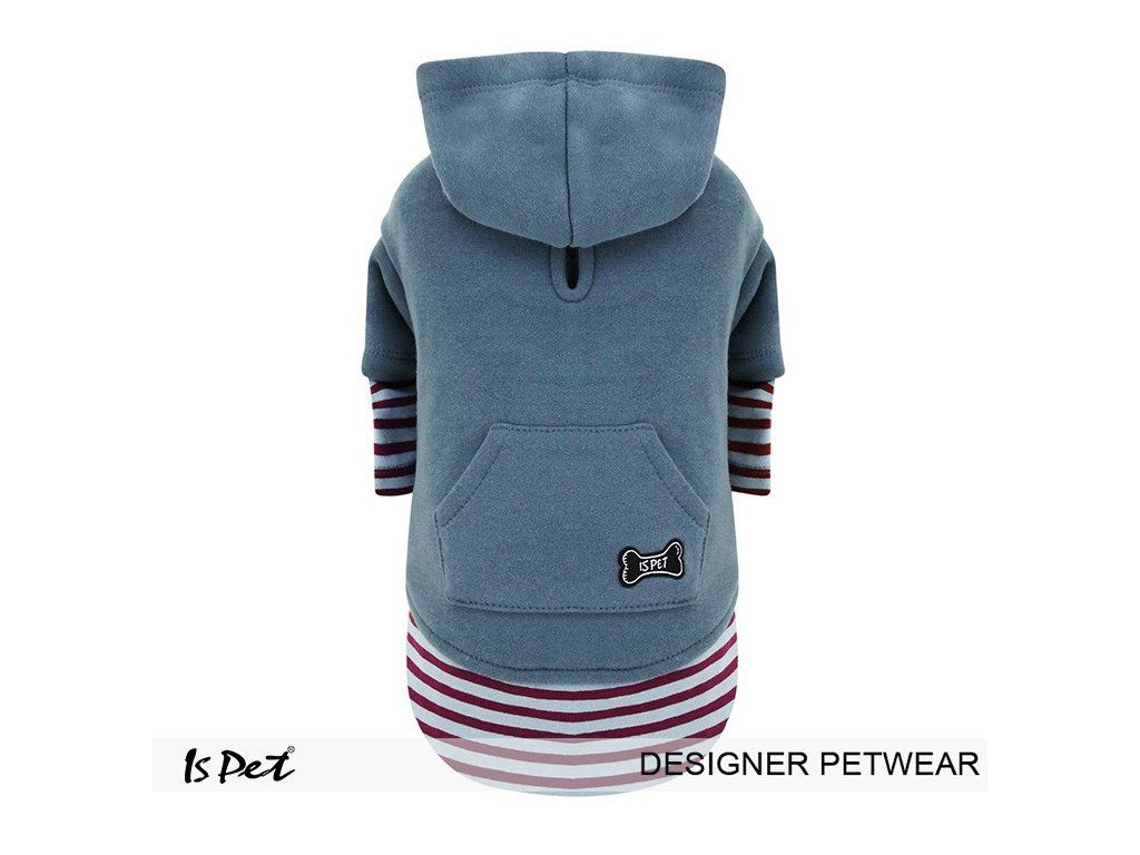 Krásná a na dotek příjemná a teplá mikina pro psa z počesané teplákoviny. Mikina je dostupná ve dvou barevných kombinacích červené a modrošedé vždy v kombinaci s pruhovaným úpletem. Mikina má kapucku a praktický otvor pro vodítko. Mikina je převážně bavlněná a částečně pružná. Na bříšku je guma aby pod mikinu nefoukalo a zároveň aby pěkně seděla a na zádech je kapsička.