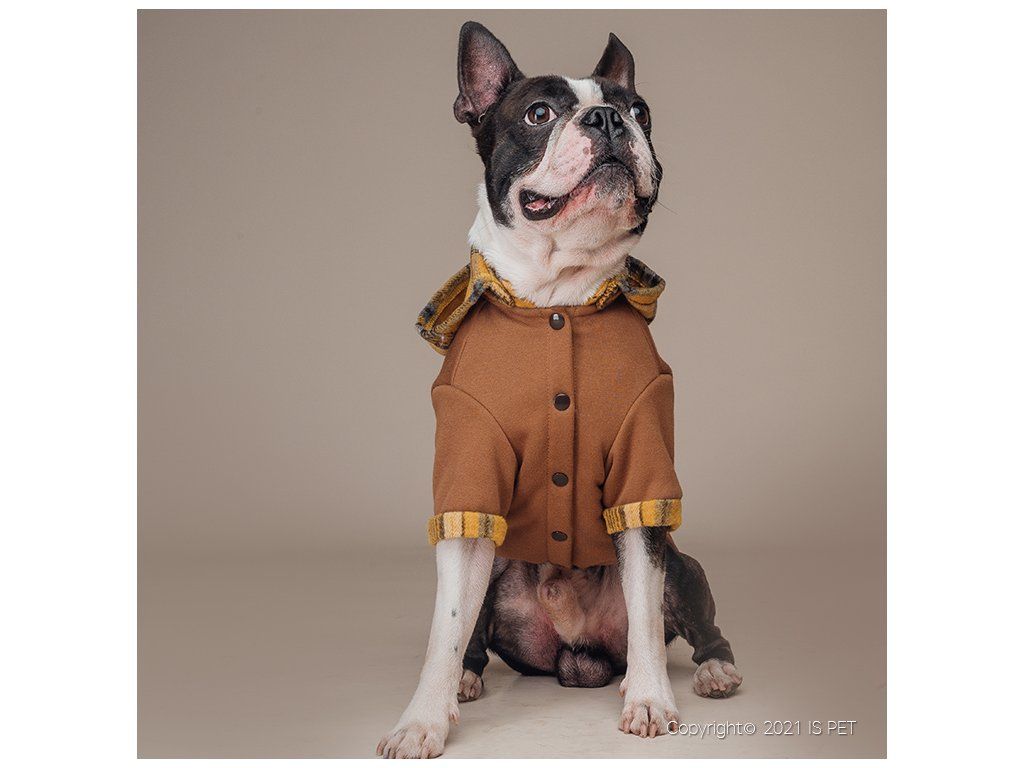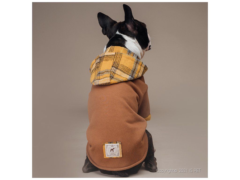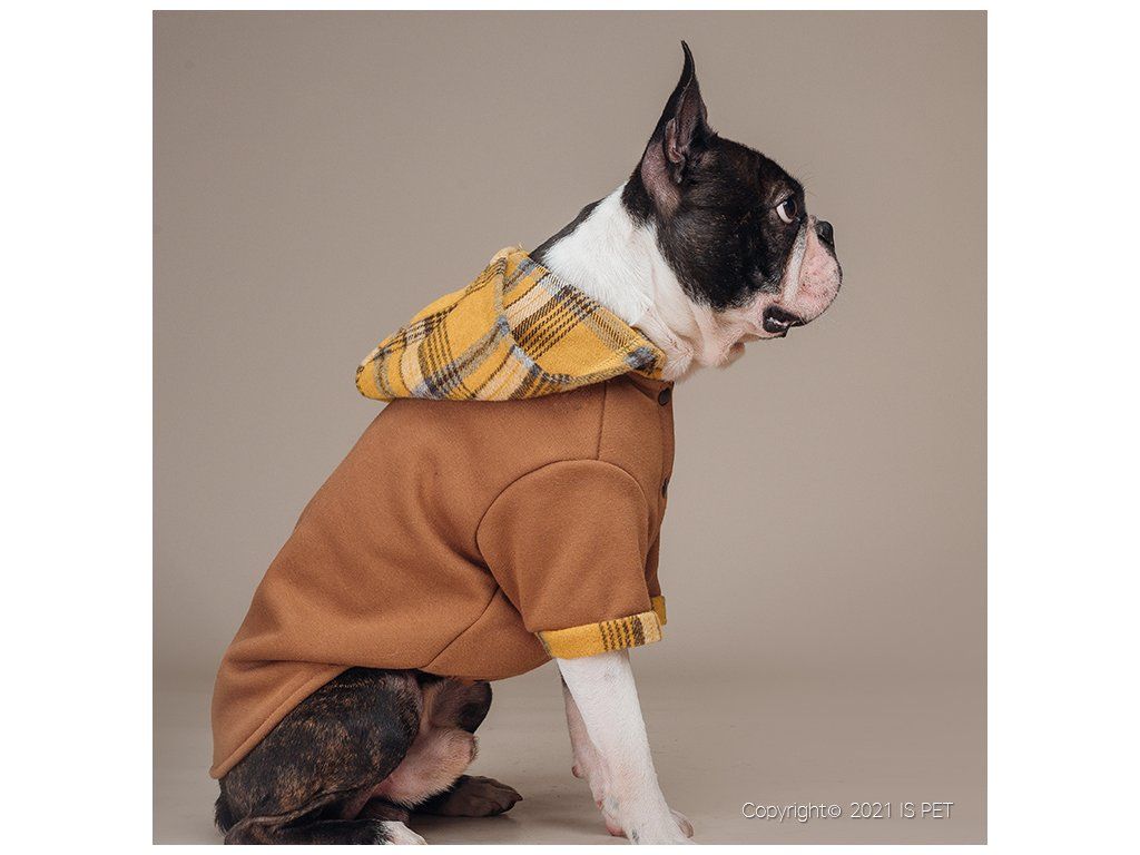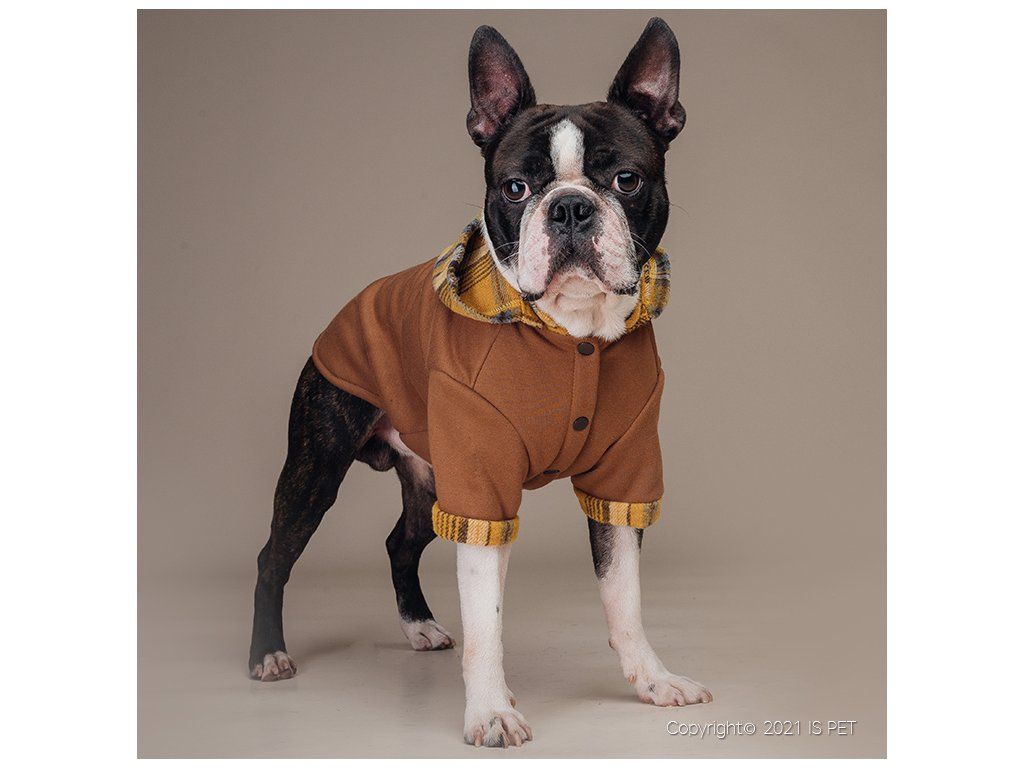 Krásná a velmi příjemná mikina z teplákoviny v hnědé barvě s károvanou kapucou. Mikina je teplá, je vyrobena z počesané teplákoviny. Kapuca je odepínatelná. Mikina se zapíná na patenty na bříšku pejska.