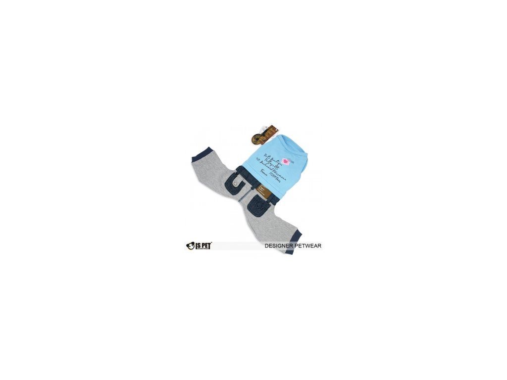 Krásná psí souprava skládající se z bavlněného trička v barvě modré s moderním potiskem na zádech a kalhot v provedení teplákovina - riflovina. Kalhoty mají prošívané riflové kapsičky a riflový pás. Tričko lze odepnout pomocí patentků a nosit jen samotné tričko. Vhodné jako domácí obleček , pro pejska velmi pohodlné.Sleva 55%doprodej posledních kusů.