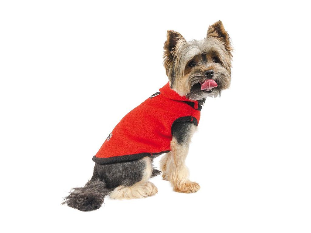 Praktická fleecová vesta, která díky více vrstvám fleecu rozhodně neprofoukne. Oblékání je jednoduché, převlékne se přes hlavu a na boku je zapínání na patentky. Na zadní straně je úchyt na připojení vodítka.